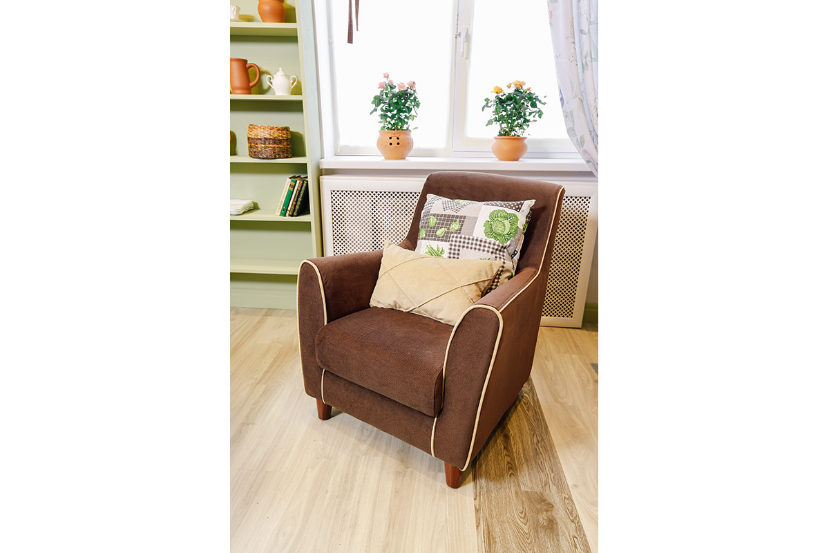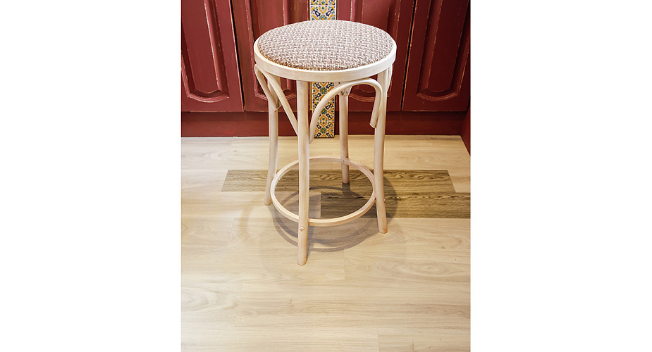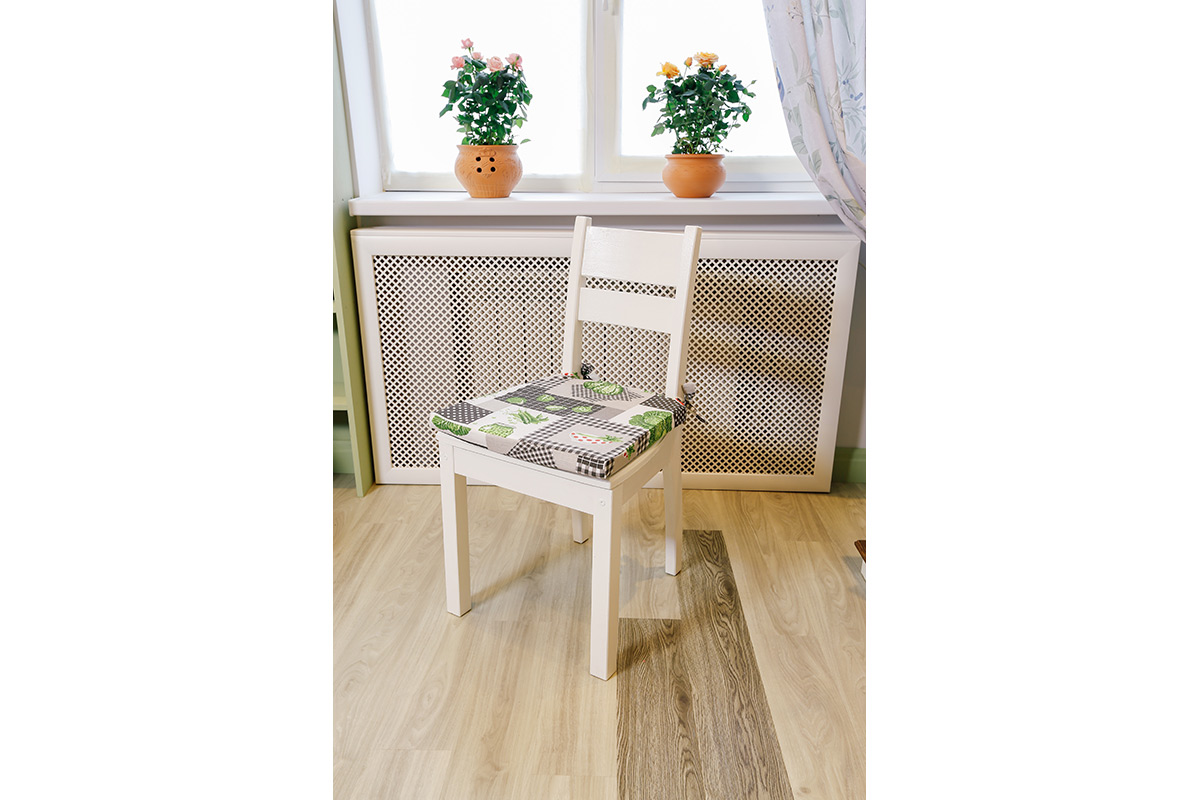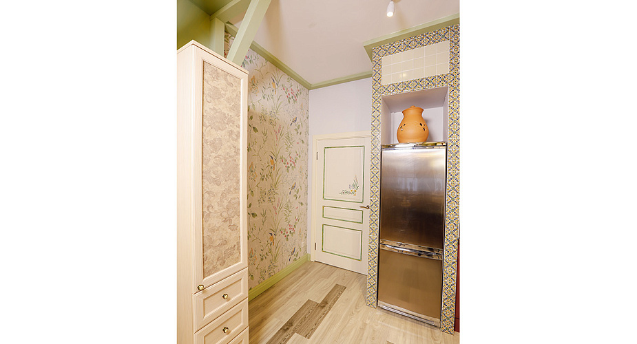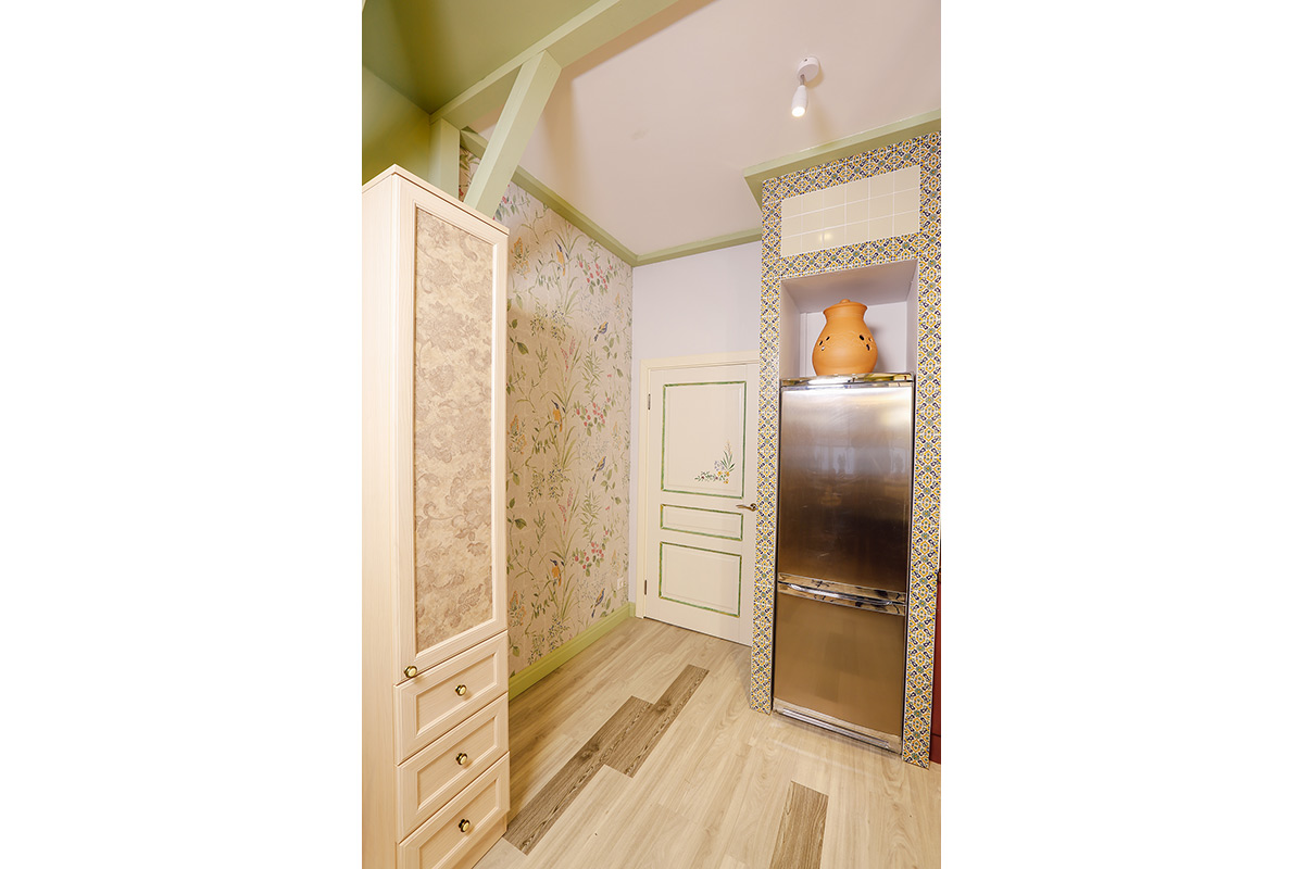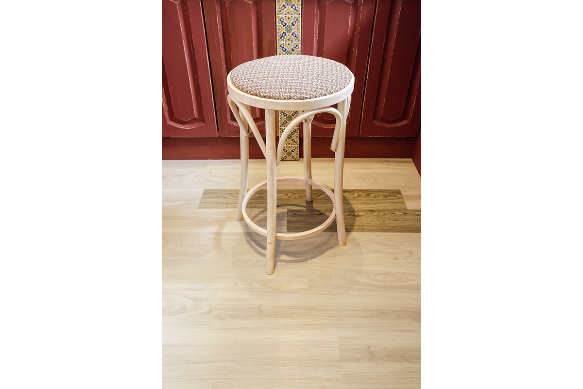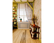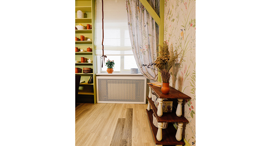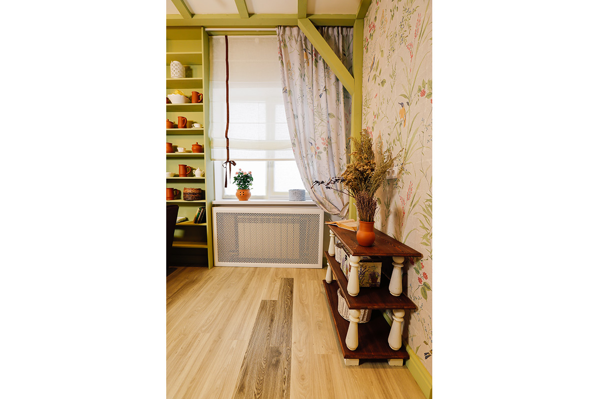 Напольное покрытие сыграло здесь немаловажную роль. Для пола дизайнер выбрала кварц-виниловую плитку ПВХ светло-серого цвета Клен белый YDM 19-2 с выраженной деревянной фактурой, и Дуб карри YDM 05-9, для придания легкого контраста. Она идеально сочетается со стенами и прекрасно подходит для создания теплоты и домашнего уюта. Помимо эстетической стороны эта плитка хороша и практическими качествами. Экологична, ударопрочна, поглощает шум, не боится воды, легко моется – что особенно актуально для кухни!
