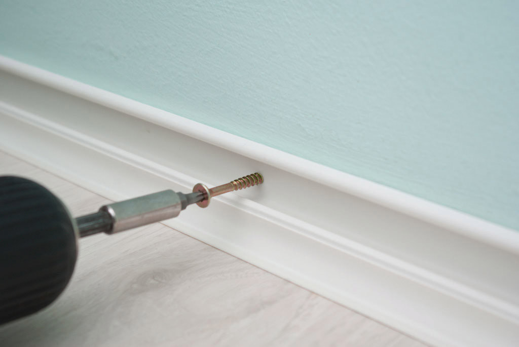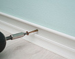 - Монтаж. При использовании специальных креплений, клипсы необходимо предварительно закрепить на поверхности стены. Затем на них устанавливается непосредственно плинтус. При попадании в пазы слышен небольшой щелчок. Прикрепление плинтусов при помощи саморезов осуществляется к стене или полу. Для этого в поверхности делают отверстия. При установке важно следить, чтобы планка плотно прилегала к поверхности пола. В случае, когда для монтажа используется клей, он наносится непосредственно на обратную сторону плинтуса, после чего изделие быстро придавливается к полу в месте монтажа. Необходимо дождаться, пока клей схватится. При возникновении зазоров их необходимо дополнительно проклеить.